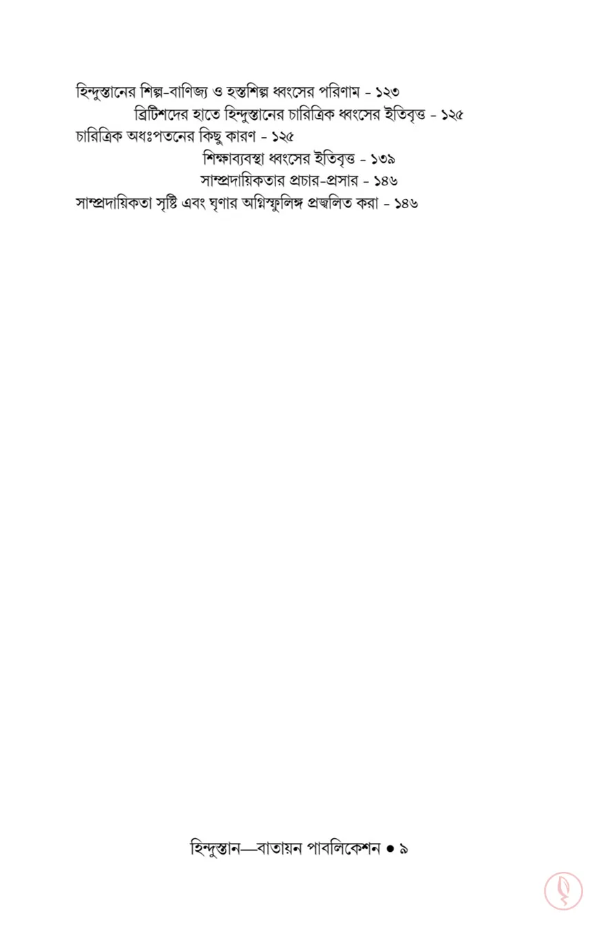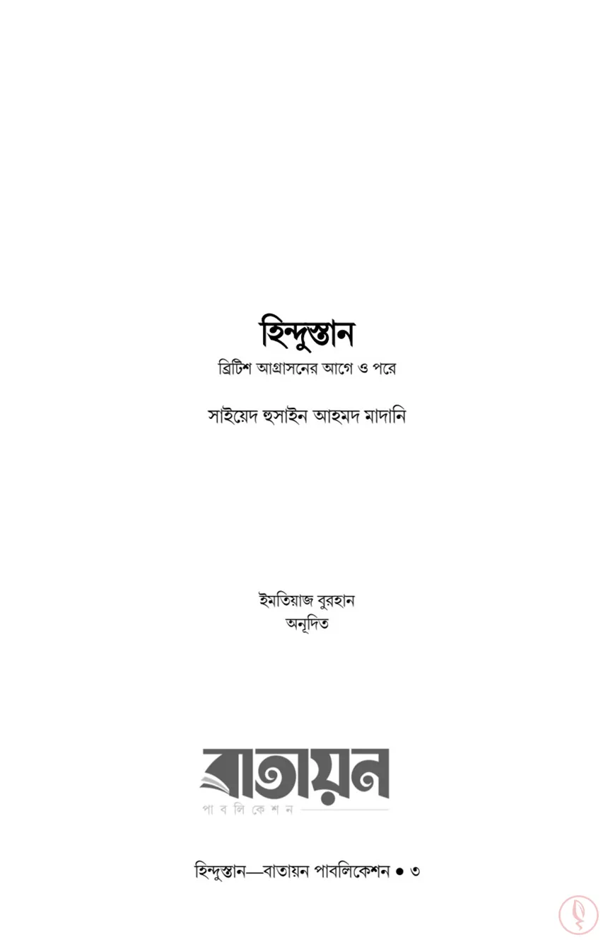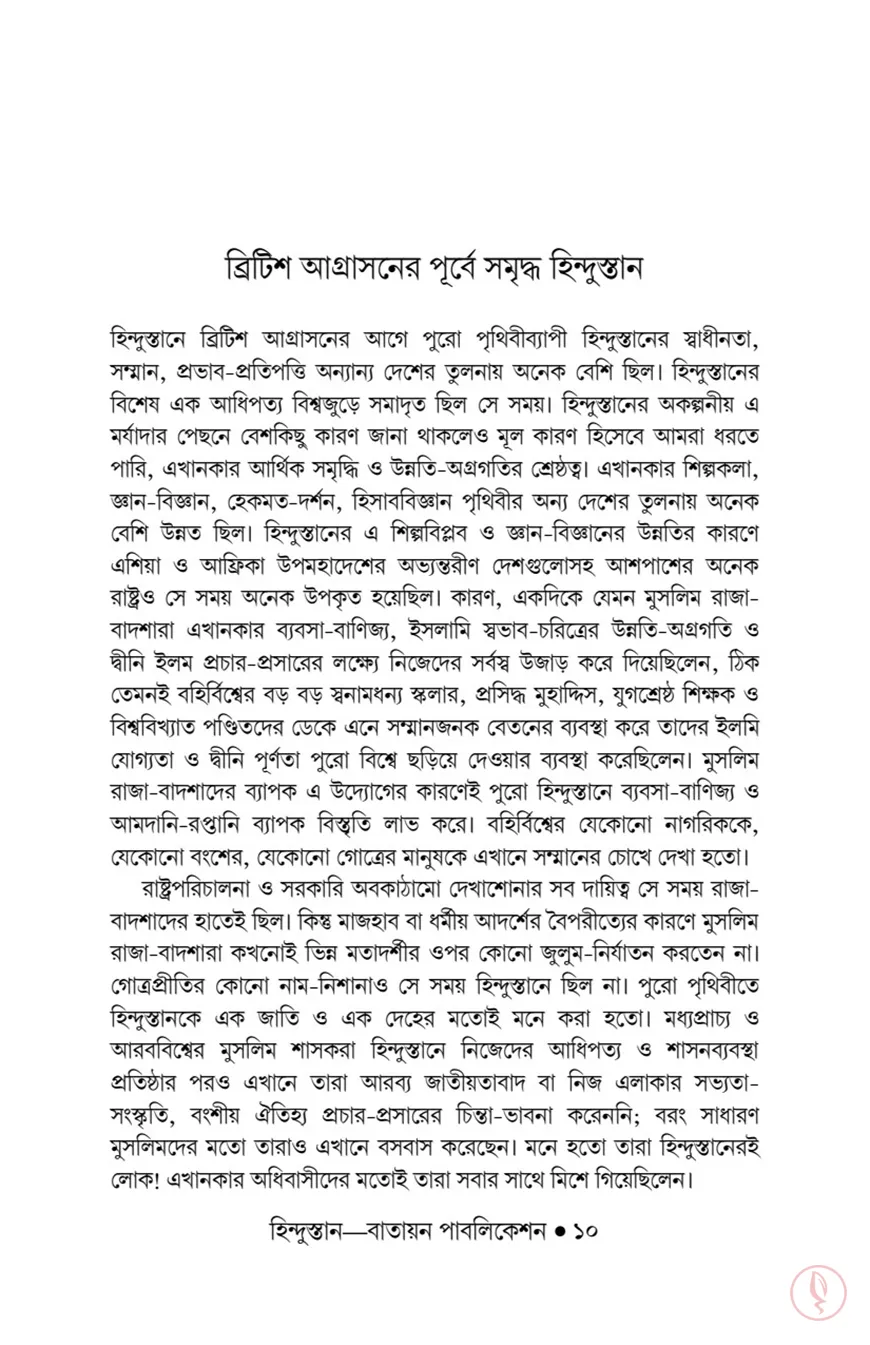 সাইয়েদ সালমান মানসুরপুরী মুদ্রিত মূল্য: 200 টাকা পৃষ্ঠা: 128 ইংরেজরা দীর্ঘ দুইশ বছর ভারত উপমহাদেশ শাসন করেছে। জুলুম-অত্যাচার আর লুণ্ঠনে দেশটির অবস্থা নাজেহাল করে ছেড়েছে। এ দেশের সম্পদ দিয়ে নিজেদের দেশে তথাকথিত ‘শিল্প বিপ্লব’ বাস্তবায়ন করেছে। ভারত উপমহাদেশের সেই পূর্ব রূপ-লাবণ্য, ইংরেজদের শোষণ-লুণ্ঠনের ইতিহাস জানতে পারবেন ‘হিন্দুস্তান : ব্রিটিশ আগ্রাসনের আগে ও পরে’ বইটি থেকে।