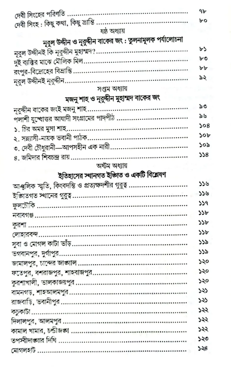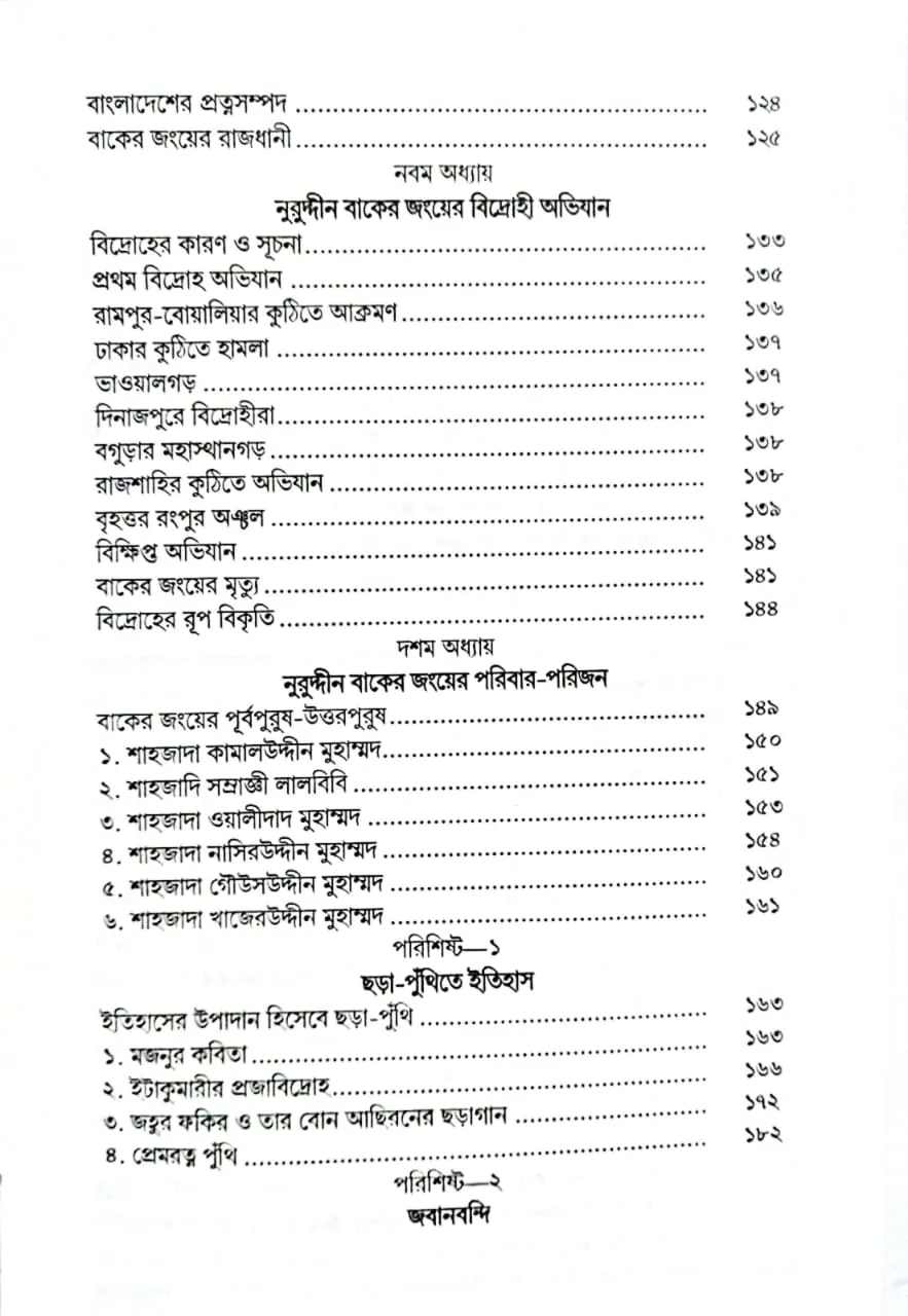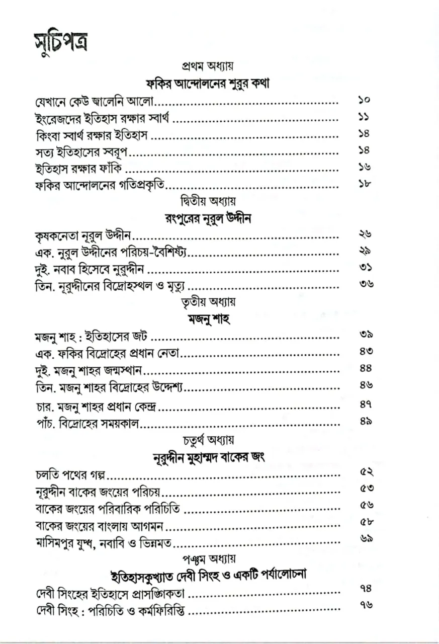 ফকির বিদ্রোহ ও মজনু শাহ: এহসানুল্লাহ জাহাঙ্গীর মুদ্রিত মূল্য: 300 টাকা পৃষ্ঠা: 192 নবাব সিরাজউদ্দৌলার মৃত্যুর পর ইংরেজদের সামনে সবচেয়ে বড় বাধা হয়ে উঠেছিল ফকির বিদ্রোহ ও তার নায়ক মজনু শাহ উরফে নবাব নূরুদ্দীন বাকের মুহাম্মদ জং উরফ কৃষকনেতা নূরুলদীন। নিকৃষ্টভাবে এই বিদ্রোহ প্রতিহত করার পর বাংলার প্রথম স্বাধীনতা সংগ্রামকে সামান্য গুটিকয়েক ফকির-সন্ন্যাসীর বিদ্রোহ বলে চালিয়ে দিয়েছিল ইংরেজরা। তাই আমরা এই সংগ্রামকে চিনেছি কেবল ফকির-সন্ন্যাসী বিদ্রোহ নামে। অথচ এটি ছিল বাংলাব্যাপী প্রথম স্বাধীনতা-সংগ্রাম। কীভাবে এবং কেন তারা এটা করেছিল, তার জবাব পাবেন ‘ফকির বিদ্রোহ ও মজনু শাহ’ বইটির পাতায় পাতায়।