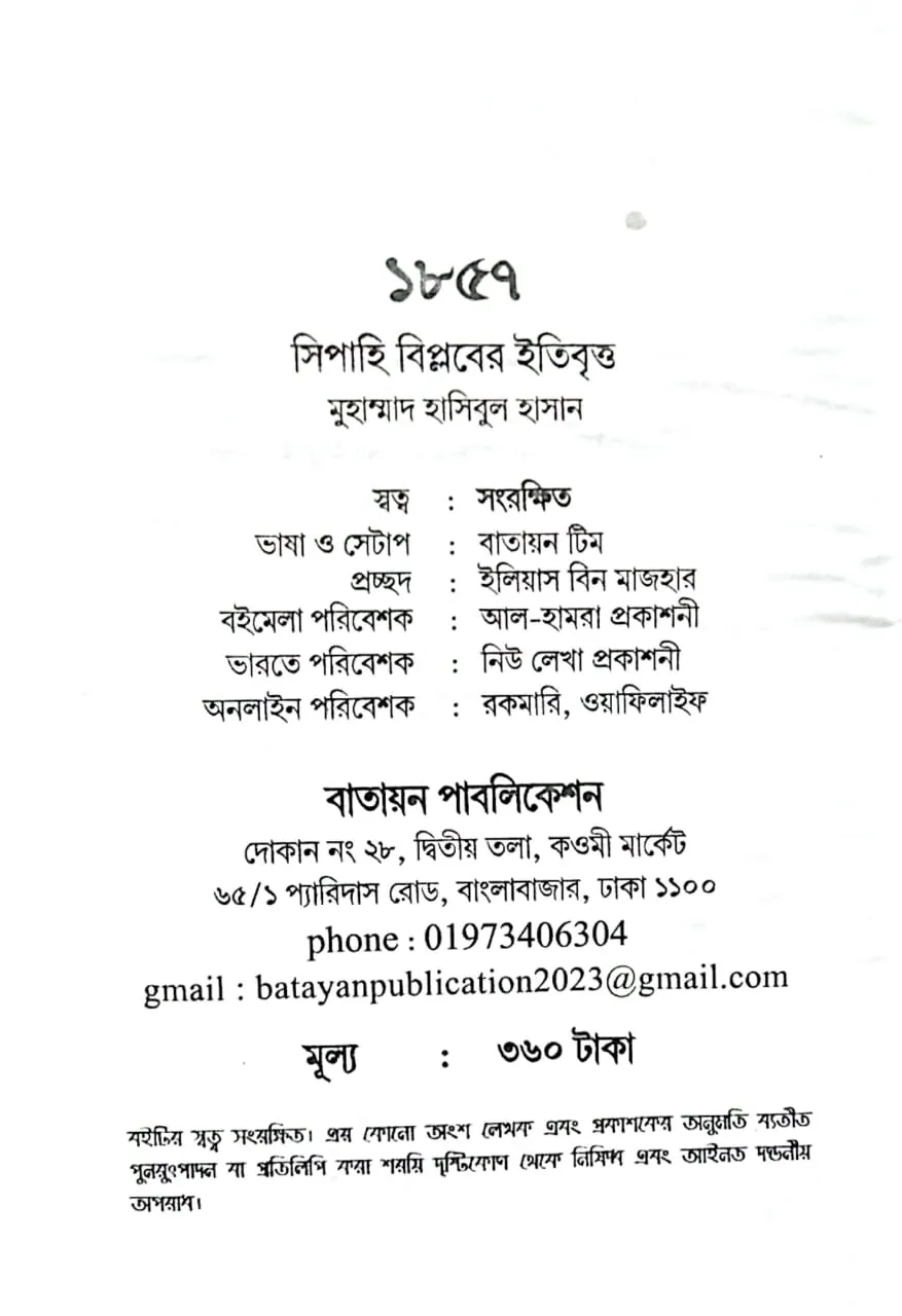 ১৮৫৭ সিপাহি বিপ্লবের ইতিবৃত্ত: মুহাম্মাদ হাসিবুল হাসান মুদ্রিত মূল্য: 360 টাকা পৃষ্ঠা: 224 ১৭৫৭ খ্রিষ্টাব্দে নবাব সিরাজউদ্দৌলার পরাজয়ের মাধ্যমে ইস্ট ইন্ডিয়া কোম্পানি ভারত শাসন শুরুর পর প্রথম ব্যাপক বিদ্রোহের মুখোমুখি হয় একশ বছর পর ১৮৫৭ খ্রিষ্টাব্দে। উপমহাদেশব্যাপী শুরু হয় আজাদি আন্দোলন। নাম দেওয়া সিপাহি বিদ্রোহ নামে। অথচ এই সংগ্রাম ছিল ব্রিটিশবিরোধী সংগ্রামে গোটা উপমহাদেশের মানুষের স্বাধীনতা সংগ্রাম। ইংরেজরা তাদের প্রয়োজনে এই সংগ্রামকে দিতে চেয়েছে ভিন্ন রূপ। বলতে চেয়েছে, এটি কোনো স্বাধীনতা-সংগ্রাম ছিল না; ছিল কেবল গুটিকয়েক সৈনিকের বিদ্রোহ। ‘১৮৫৭ : সিপাহি বিপ্লবের ইতিবৃত্ত’ তাদের সেই ধারণার ওপর আঘাত হানবে।।